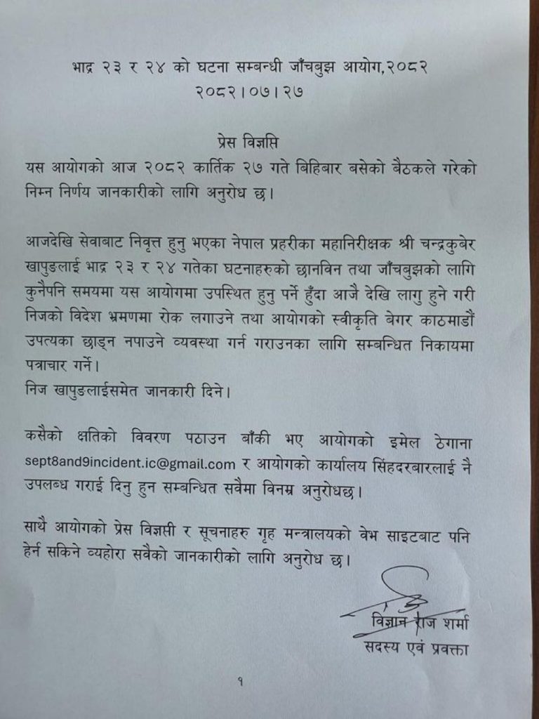 आज (२०८२/०७/२८) बाट सेवानिवृत्त हुन लागेका पूर्व प्रहरी महानिरीक्षक (आईजीपी) चन्द्रकुबेर खापुङको स्थान हद (आवतजावत) र विदेश भ्रमण रोक्का गर्ने सूचना नेपाल प्रहरीले जारी गरेको छ। यो निर्णय उनको अवकाश (२६ कात्तिकपछि) सँग सम्बन्धित अनुसन्धान वा प्रशासनिक कारणले लागू भएको देखिन्छ। थप विवरणका लागि नेपाल प्रहरीको आधिकारिक वेबसाइट हेर्नुहोस्।