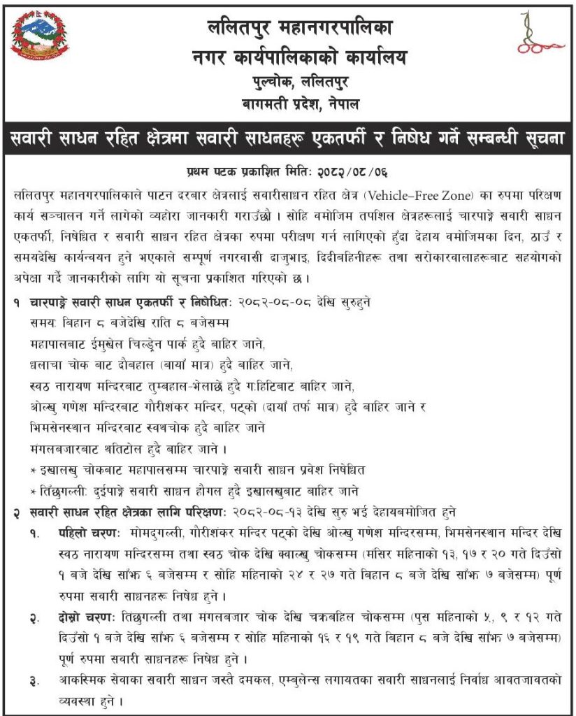 १२ मंसिर, काठमाडौं । ललितपुर महानगरपालिकाले शनिबारदेखि साताका २ दिन पाटन सम्पदा क्षेत्रलाई सवारीसाधन मुक्त (भेहिकल फ्री) घोषणा गरेको छ ।