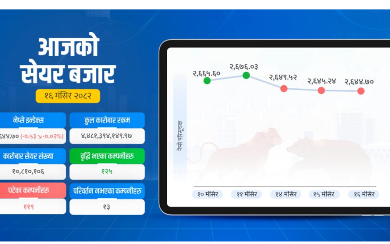 १६ मंसिर, काठमाडौं । मंगलबार सेयर बजारको परिसूचक नेप्से झिनो अंकमा घटेको छ । ०.५३ अंक घटेसँगै नेप्से परिसूचक २६४४.७० मा कायम भएको छ ।