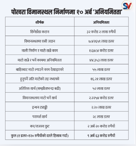 अख्तियारले विशेष अदालतमा पेश गरेको आरोपपत्र अनुसार, अस्वाभाविक रुपमा बढाइएको लागतबाट नै पोखरा विमानस्थल निर्माणमा भ्रष्टाचार भएको हो । पोखरा विमानस्थल निर्माणका लागि १६९ दशमलव ६९ मिलियन अमेरिकी डलर लाग्ने भनिएको थियो । त्यसमा १३ प्रतिशत भ्याट र ३ प्रतिशत कन्टिन्जेन्सी रकम पनि जोडिएको छ ।