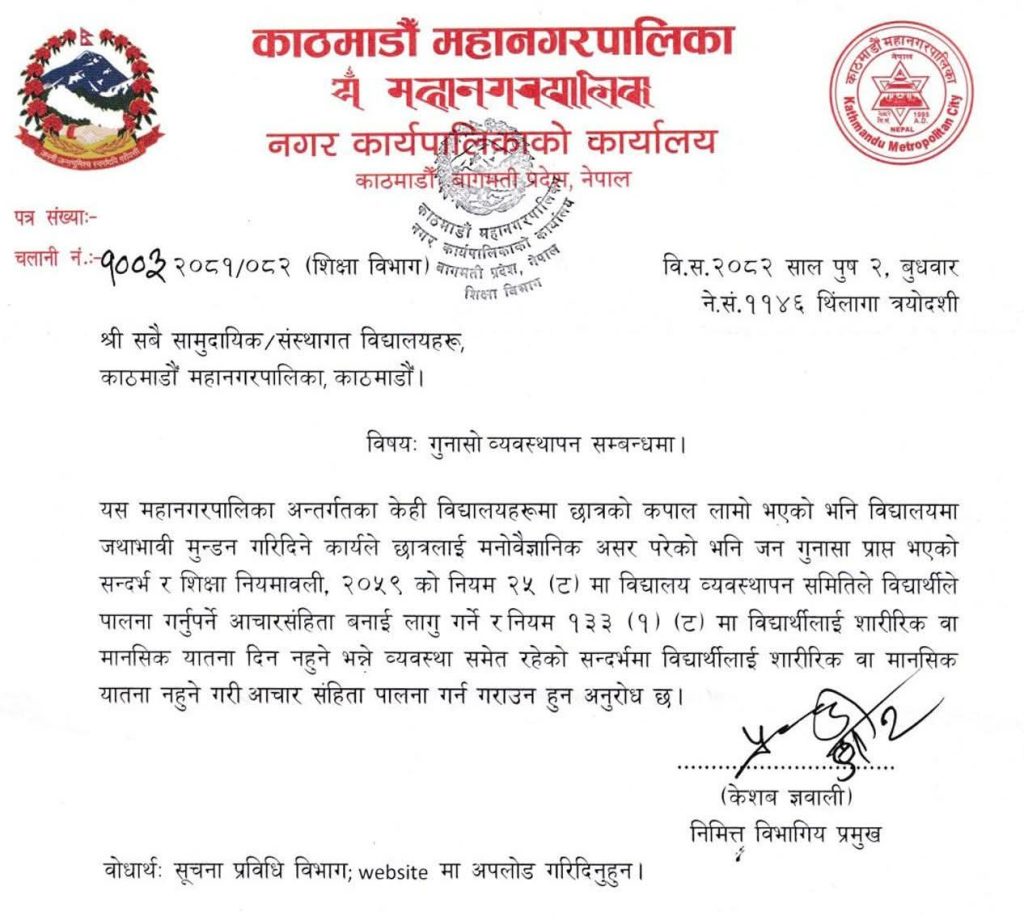 काठमाडौँ । काठमाडौँ महानगरपालिकाले आफ्ना मातहतका विद्यालयहरूलाई विद्यार्थीको कपाल लामो भएको निहुँमा जथाभाबी मुण्डन नगर्न निर्देशन दिएको छ।