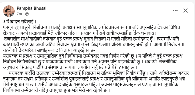 - पम्फा भुसालले आगामी फागुन २१ गते हुने निर्वाचनमा प्रत्यक्ष र समानुपातिक दुवैमा उम्मेदवार नबन्ने घोषणा गरिन्।