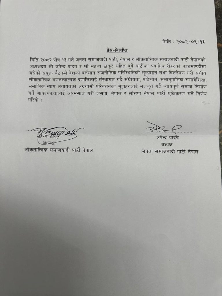 जसपा अध्यक्ष यादव र लोसपा अध्यक्ष ठाकुरसहित दुवै पार्टीका पदाधिकारीहरुको काठमाडौंमा बसेको संयुक्त बैठकले एकीकरण गर्ने निर्णय गरेको हो ।