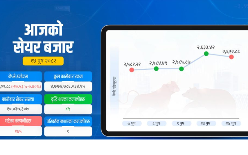 १४ पुस, काठमाडौं । आइतबार उच्च अंकले बढेको सेयर बजारमा सोमबार ‘करेक्सन’ आएको छ । १०.५३ अंकले घटेको बजार २६२२.८८ बिन्दुमा ओर्लिएर रोकियो ।