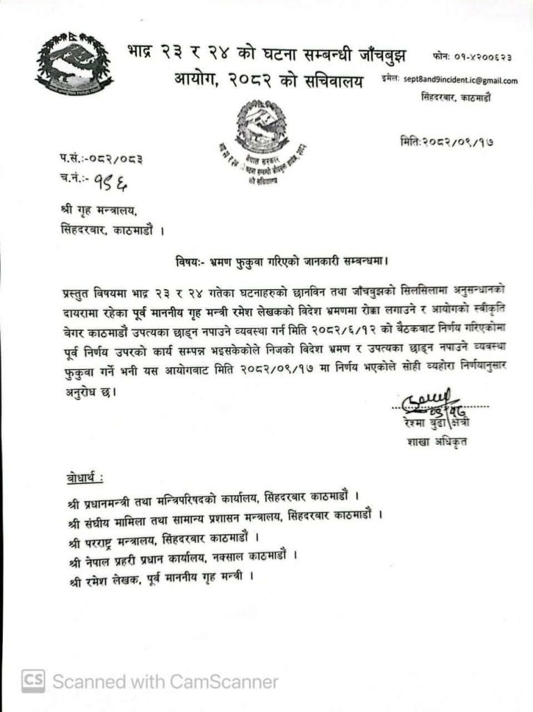 बुधबार पुरक बयानलिएसँगै आयोगले उनीविरुद्धको स्थान हद फुकुवा गरेको हो । आयोगले बिहीबार गृहमन्त्रालयमार्फत स्थान हद फुकुवा गरेको जानकारी गराइसकेको छ ।