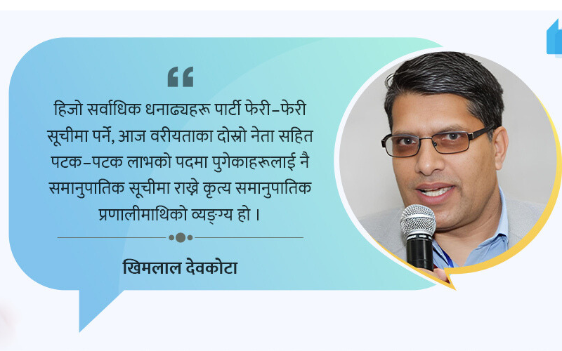 प्रतिनिधिसभाको विघटनसँगै आगामी २१ फागुनका निम्ति तोकिएको निर्वाचनको कार्यक्रम आरम्भ भएको छ । उम्मेदवार मनोनयनको कार्यक्रम अन्तर्गत दलहरूले समानुपातिक सूची निर्वाचन आयोगमा पेश गरेका छन् । प्रत्यक्ष र समानुपातिक गरी मिश्रित निर्वाचन प्रणाली अवलम्बन गरेको नेपालले एक जात, एक वर्ग, एक लिंग र एक क्षेत्रको वर्चस्वलाई तोड्दै सबैको समान प्रतिनिधित्व होस् भन्ने हेतुले समानुपातिक निर्वाचन प्रणाली अवलम्बन गरिएको हो ।