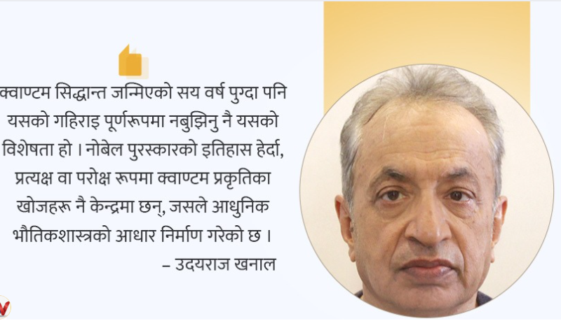 हाइजनबर्गले भौतिक गुणहरूको क्वाण्टम गणना गर्ने ‘मेट्रिक्स मेकानिक्स’ प्रतिपादन गरेको शताब्दी मनाउन संयुक्त राष्ट्रसङ्घले घोषणा गरेको ‘अन्तर्राष्ट्रिय क्वाण्टम वर्ष २०२५’ मा यसैका शोधकर्ता नोबेल पुरस्कृत भए। एक्स-रे र त्यसको उपयोगिता खुलासा गरेर पहिलो विजेता बनेका रोन्टजेनदेखि नै, क्वाण्टम प्रकृतिका प्रत्यक्ष र परोक्ष रूप खोल्नेकै बाहुल्य छ। दिक्-कालीन वक्रता बराबरको ऊर्जा-पदार्थ गुरुत्वाकृष्ट हुने सापेक्षवादका निर्माता आइन्सटाइनको प्रशस्तिमा उल्लिखित फोटोइलेक्ट्रिक असर पनि क्वाण्टम नै हो। सूक्ष्म मापनको परिमाण र क्वाण्टम गणनाको अन्तर अर्बको एक भागमा झार्ने क्रममा, क्वाण्टम बुझ्न खोज्नेलाई गुरुले भन्थे— ‘चुप लागेर गणना गर।’