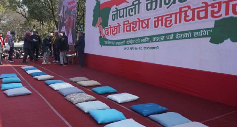 महाधिवेशनको मञ्चमा केही कुसनहरू राखिएको छ । जहाँ कुर्सी राखिएको छैन ।
