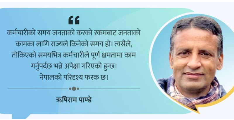 कर्मचारीको समय जनताको करको रकमबाट जनताको कामका लागि राज्यले किनेको समय हो। त्यसैले, तोकिएको समयभित्र कर्मचारीले पूर्ण क्षमतामा काम गर्नुपर्दछ भन्ने अपेक्षा गरिएको हुन्छ। तर, नेपालको परिदृश्य फरक छ।